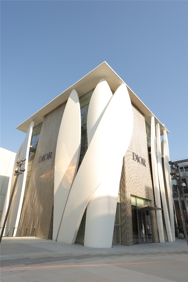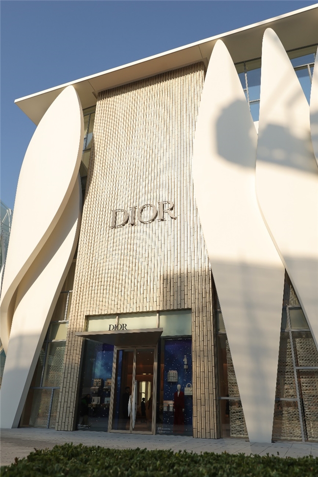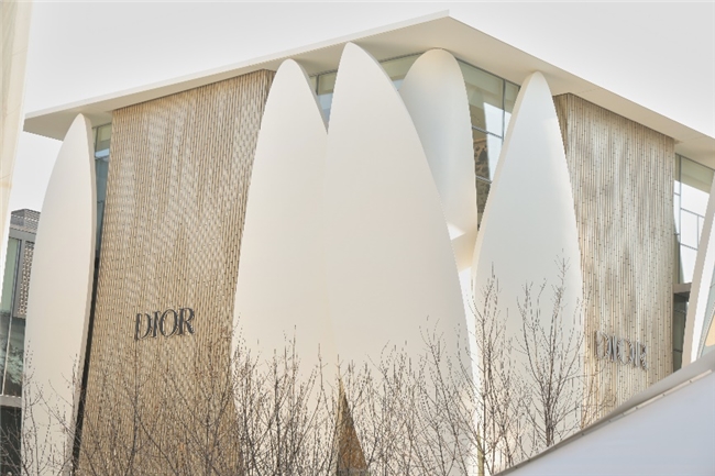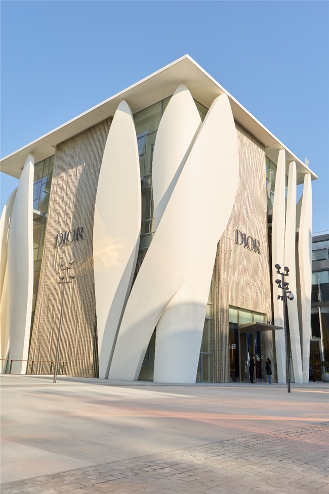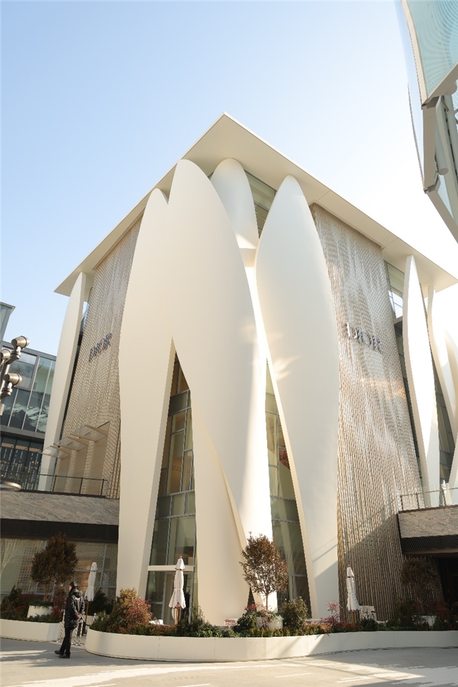 北京迪奥之家于三里屯揭幕,携手普利兹克建筑奖的建筑师,克里斯蒂安德包赞巴克(Christian de Portzamparc),共同构筑这座五层独立建筑。其外立面以十四片流动的金色花瓣构成,设计灵感源自克里斯汀·迪奥先生裁剪高级订制礼服时,白坯布所呈现的灵动线条与自然褶皱——这一经典元素亦贯穿于品牌早期的裙装设计中,如今化作建筑语言,于都市中定格永恒的诗意。这不仅是一座精品店,更是一份对时装与艺术的致敬。